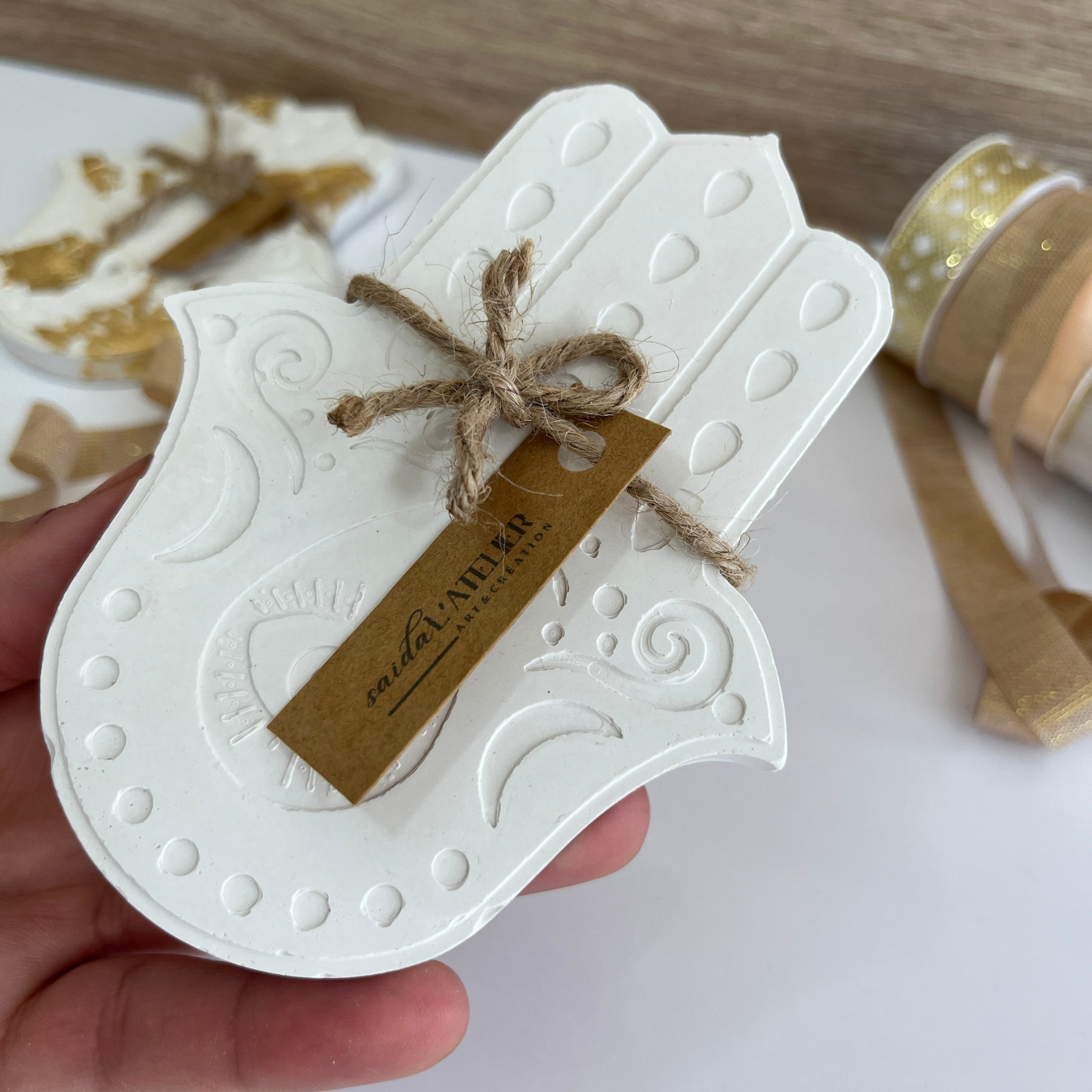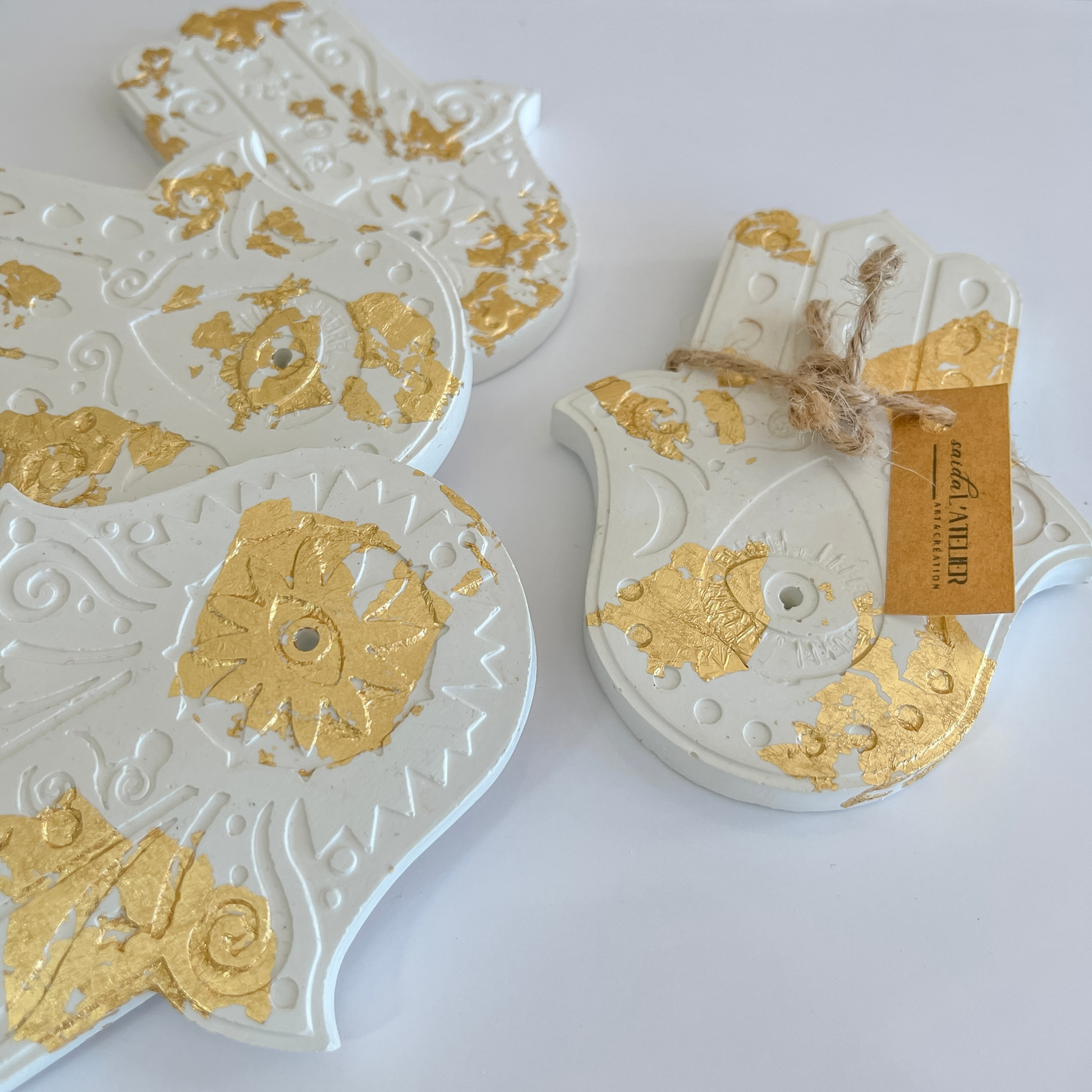 Bienvenue dans ma collection Hamsa comprenant deux modèles de porte-encens, blanche & Blanc avec quelque feuille d'ors, fabriqués à la main à partir de ciment dans notre petit atelierdans le sud ouest de la France.