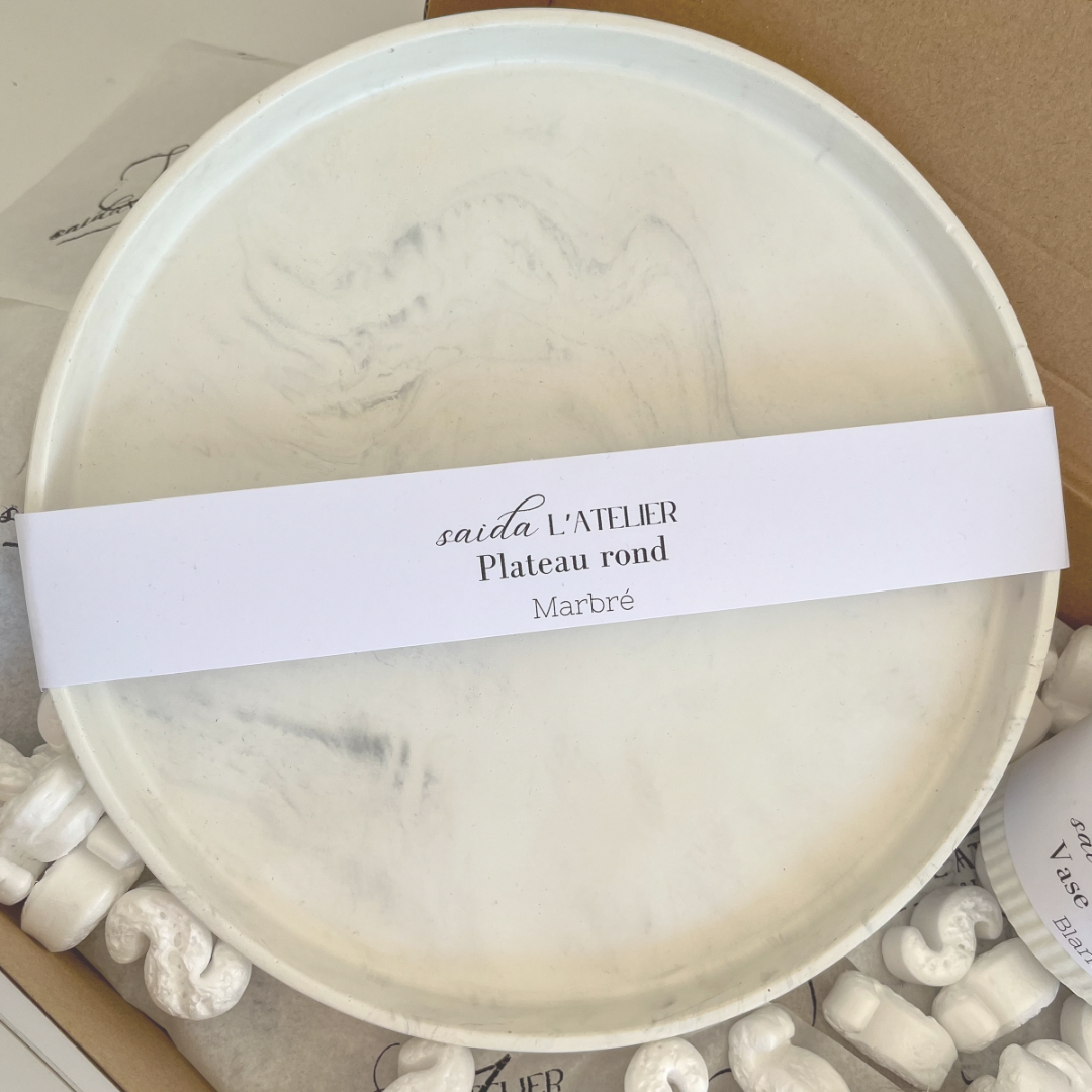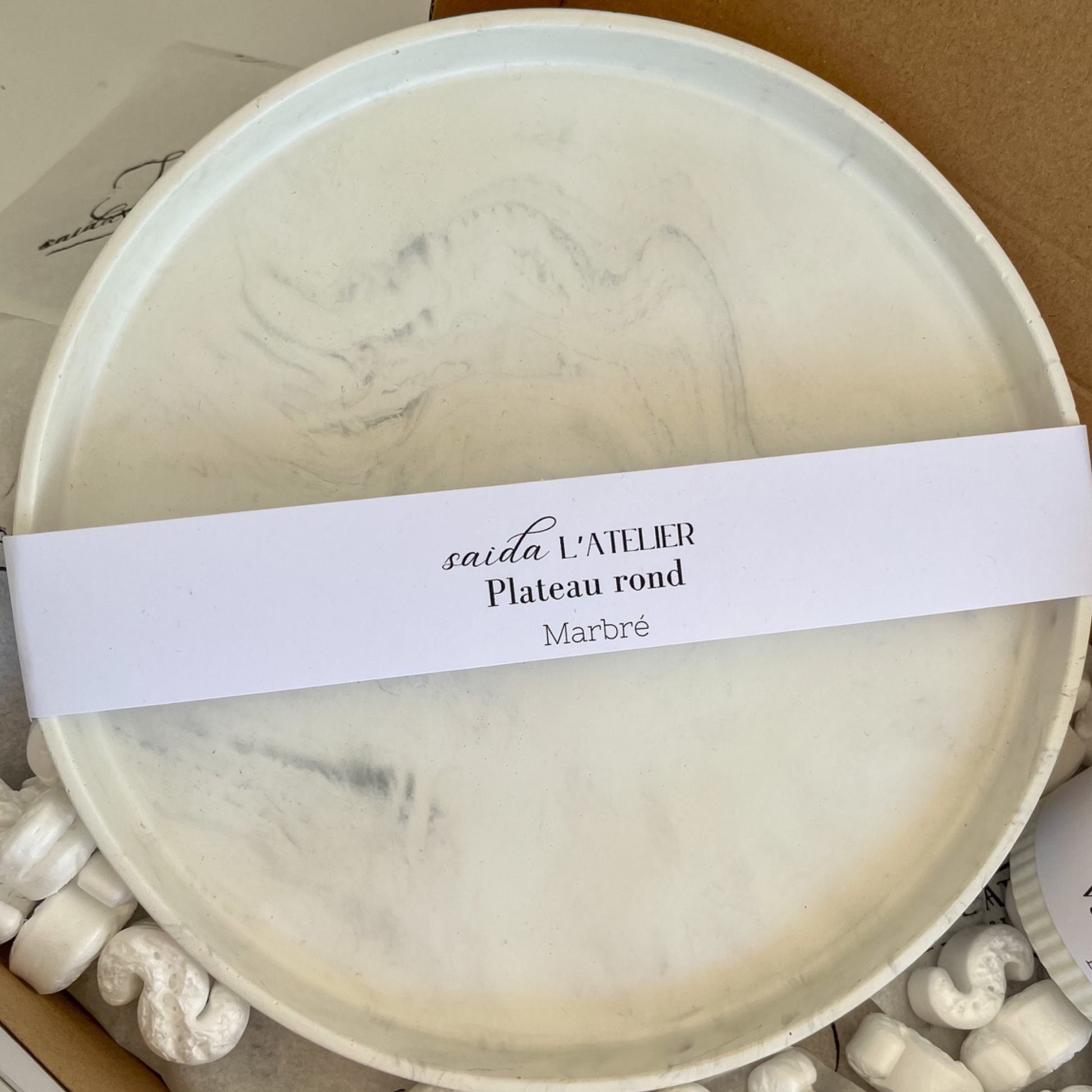 Grand plateau rond décoratif en ciment couleur blanc légèrement marbré.